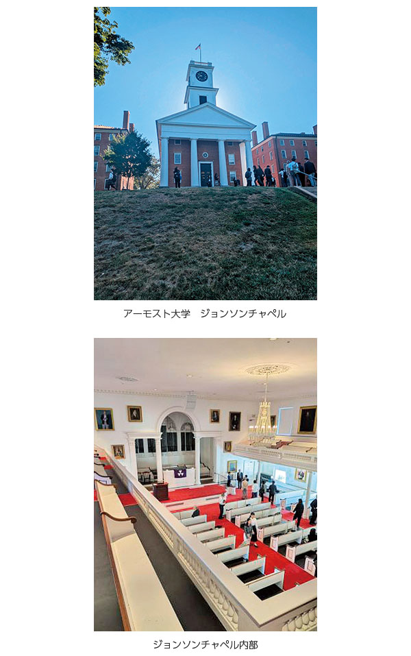 ツアーはまず、アーモスト大学ジョンソンチャペルでの記念集会から始まりました。アーモスト大学は新島襄が卒業した大学であり、リベラルアーツカレッジとして現在も全米有数の大学です。リベラルアーツカレッジとは、一つの専門に特化するのではなく、よき市民として必要な教養を幅広く身につける教養教育を行う単科大学(カレッジ)です。「知、徳、体のバランスの取れた教育」は現在の日本のどこの学校でも志していることですが、これを最初に始めたのがアメリカのリベラルアーツカレッジであり、アーモスト大学もその内の一つです。新島襄は知徳体のバランスを重視した教育を最初に経験し、最初に志した日本人なのです。ジョンソンチャペルは新島襄の在学時から存在し、彼が礼拝を守った場所でもあります。その同じ場所に立つことができること、改めて感激しました。