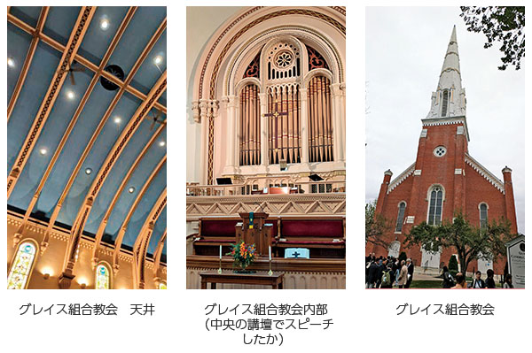 1874年10月9日、新島襄も所属していた宣教師派遣団体であるアメリカンボードの年次大会がグレイス組合教会を会場に行われました。アメリカンボードの準宣教師として日本に派遣されることになっていた新島襄に挨拶のスピーチをする機会が与えられました。通常でしたらこれから派遣される日本、彼にとっては帰国する祖国日本ですが、そこでキリスト教を広め、多くの教会を築く決意を述べるべきところです。しかし新島襄は、これからの日本には自分自身が学んだアーモスト大学のようなキリスト教主義による高等教育が必要であること、その大学設立のために資金の協力をしてもらいたい旨のスピーチを行いました。