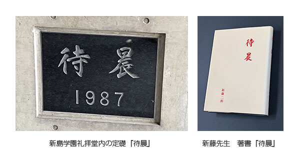 《待晨》とは聖書の言葉から引用された造語で、主の到来を待ち望むという意味で使われています。新藤先生がご退任後に発刊された著書の題名に使われています。また、1987年献堂の新島学園礼拝堂の定礎の文字にも使われています。こうしたことから考えると、新藤先生の座右の銘の一つであったろうと考えられます。今回は先生を偲び、久しぶりに著書《待晨》を読み直しました。内容はその多くが新島学園の「学園だより」に書かれた巻頭言の文章です。年代順にこだわらず配置し、文体には多少の手直しをしてまとめ直したと記されています。